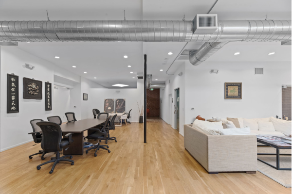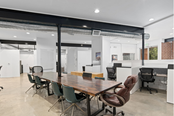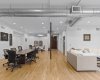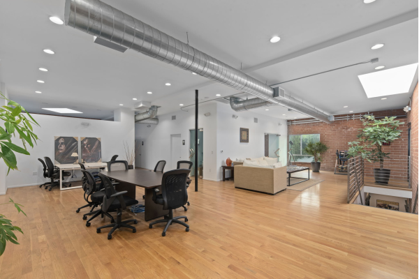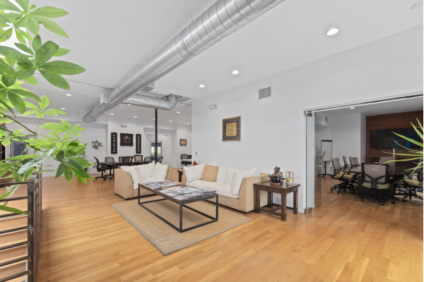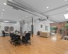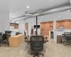 - Layout includes an open bullpen, kitchen, conference room, multiple restrooms, and private offices